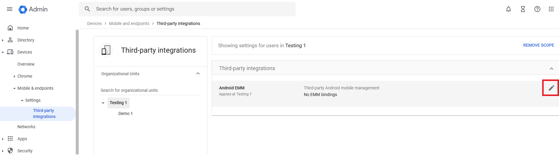 - Click the edit icon to open the Android EMM settings.