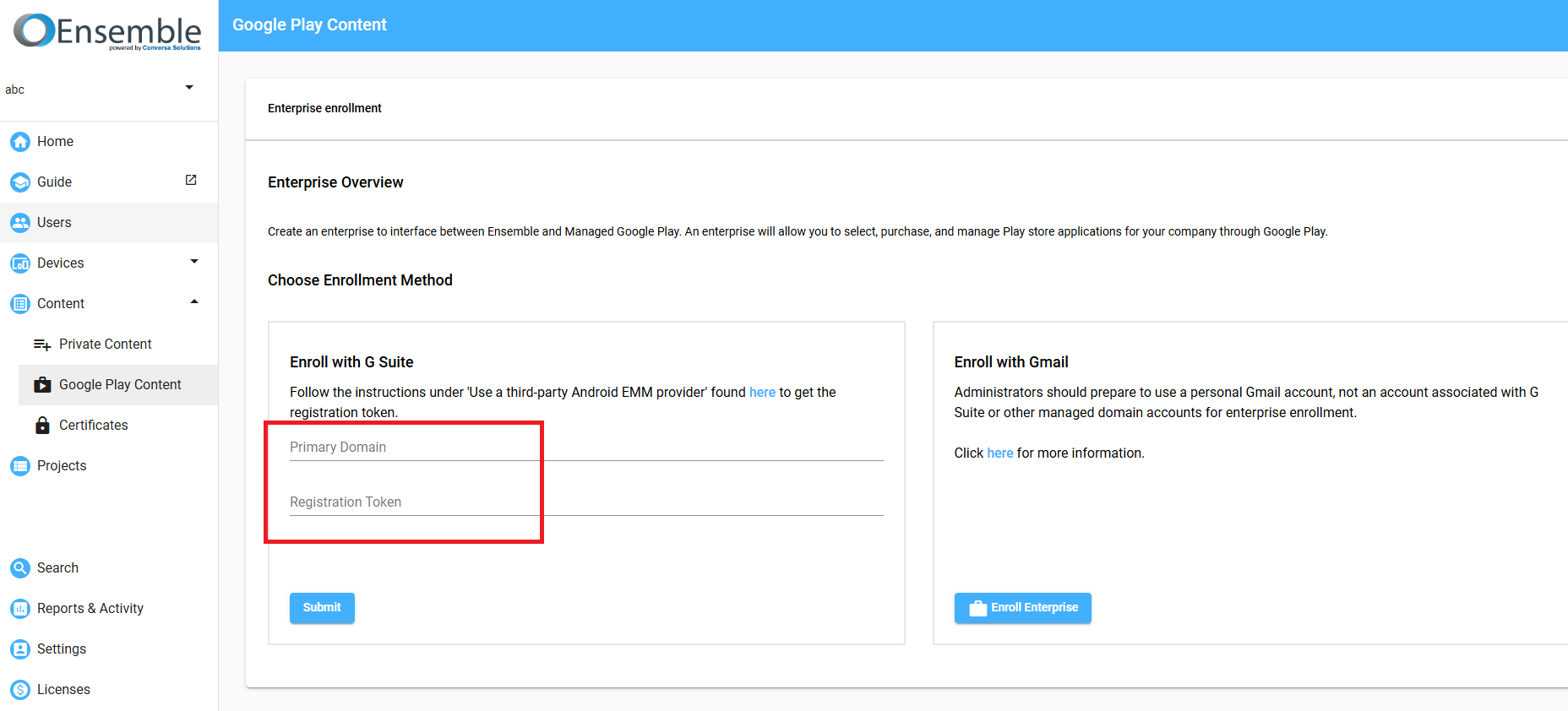 - Go to the Google Play Content page and enter the primary domain and registration token.