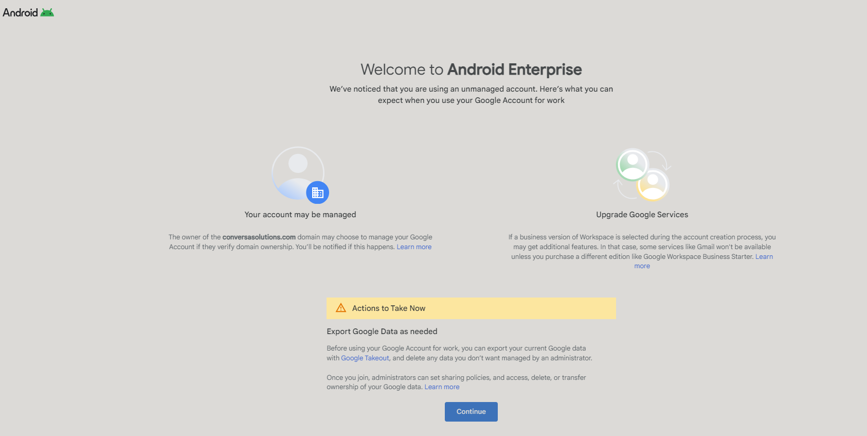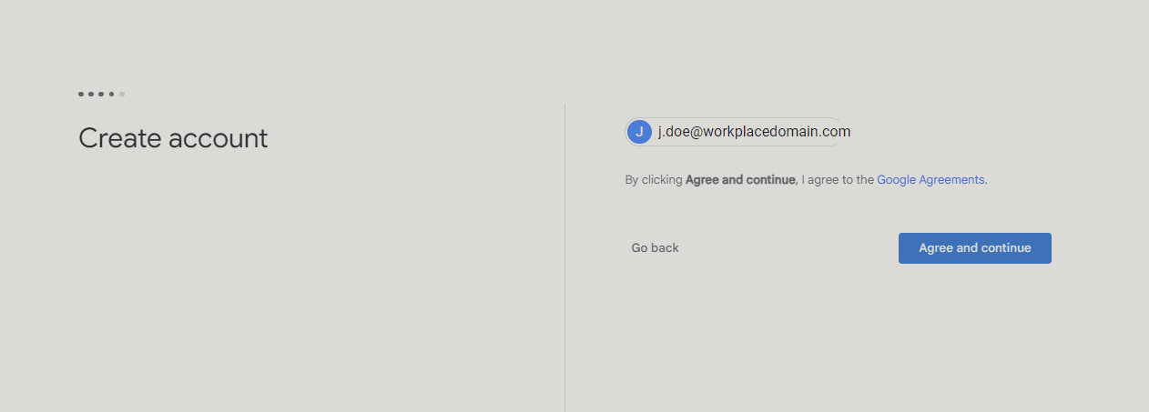 Here, Google presents you with a warning that the account may be managed by the domain owners, and if there are any new updates to Google services, access may be lost without purchasing additional editions of Google Workplace.