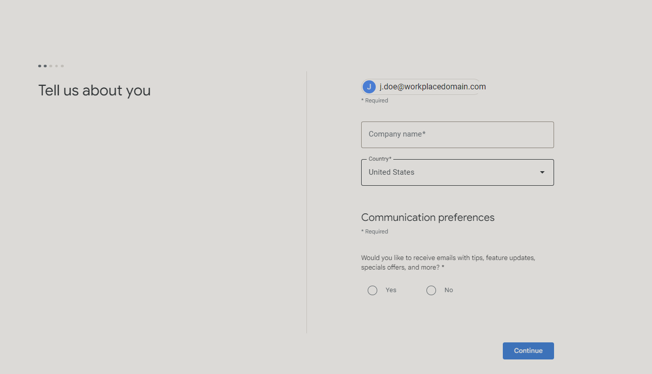 - Enter your Company name, ensure the country is selected correctly, and choose if you'd like to receive emails from Google. After selecting Yes or No, press Continue.