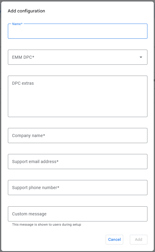 Fill out the fields as needed using your company's information. You can include a message in the Custom Message field, change the locale, or change the main color of the configured devices if you choose. The only required fields are Configuration Name, Company Name, Contact Phone Number, and Contact Email.