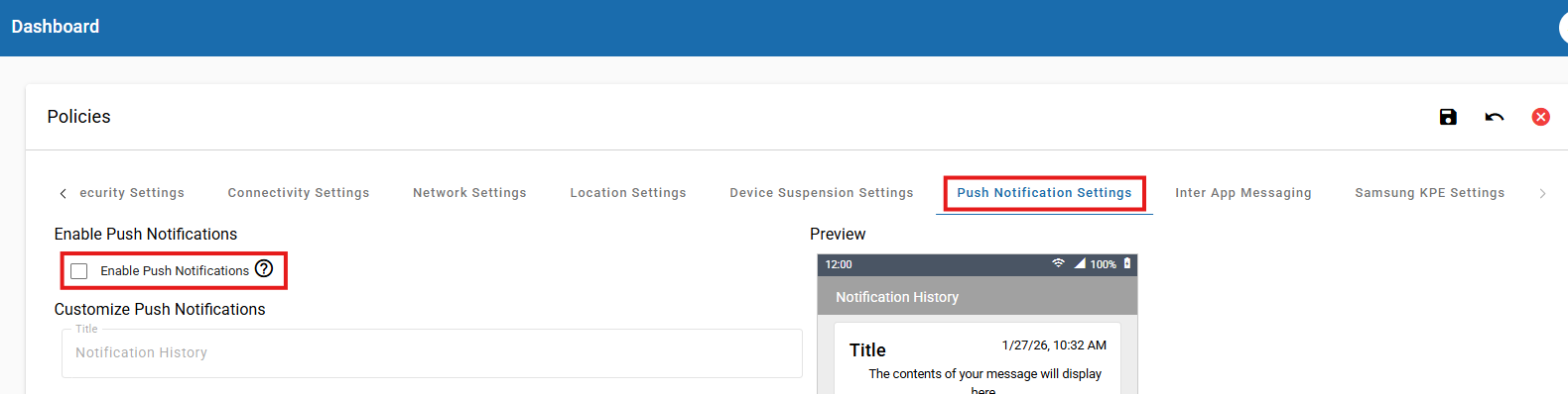 Within Ensemble, you can send enable Push Notifications to your fully managed devices. Below, you will find the instructions for the different methods for enabling the notifications, customizing the branding of the notification history screen, and exporting previously sent messages.