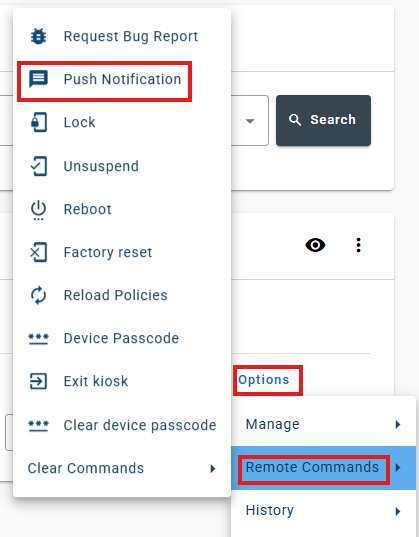 - Click on "Options" > "Remote Commands" to the right of the device you would like to send a push notification to in the devices table.
