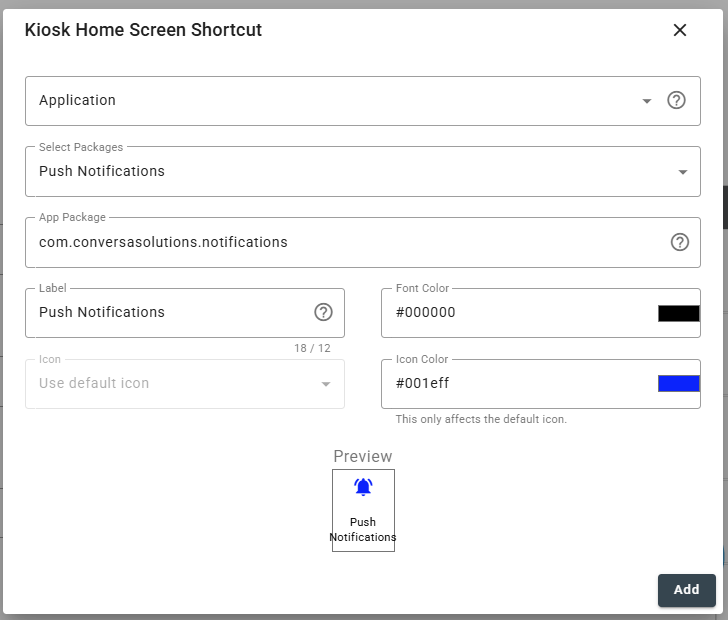 - From there, you can add a label, change the font and icon color if you wish, and then click Add to add the shortcut to the kiosk home screen.
