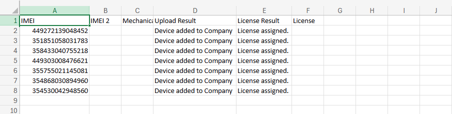 This is an example you may see when uploading both Android and Apple devices, along with invalid IMEIs, to give you an idea of what to expect in the Results Summary page.