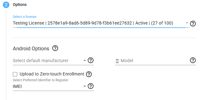 - If the devices being added are Android devices, you can then select the default manufacturer, model, and the preferred identifier (Serial or IMEI #), as well as choose to upload the devices to Zero-Touch enrollment.