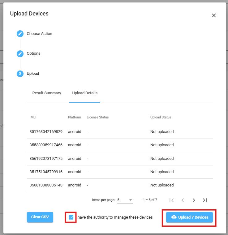 - Attach the .CSV, then click the button at the bottom "I have the authority to manage these devices", and finally click "Upload X Devices".