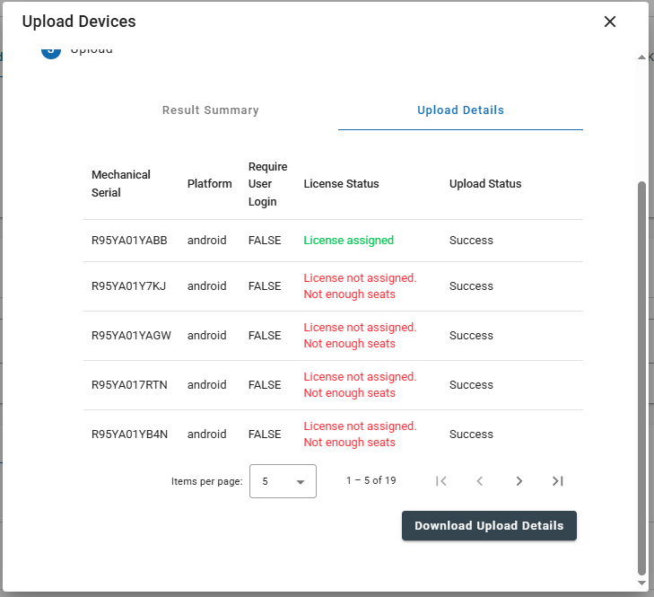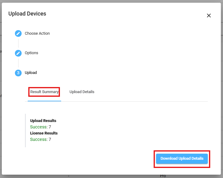 - Once the .CSV has been uploaded, the window will switch to the Result Summary tab, showing the upload results. You can export the details as well, by clicking the "Download Upload Details" button.