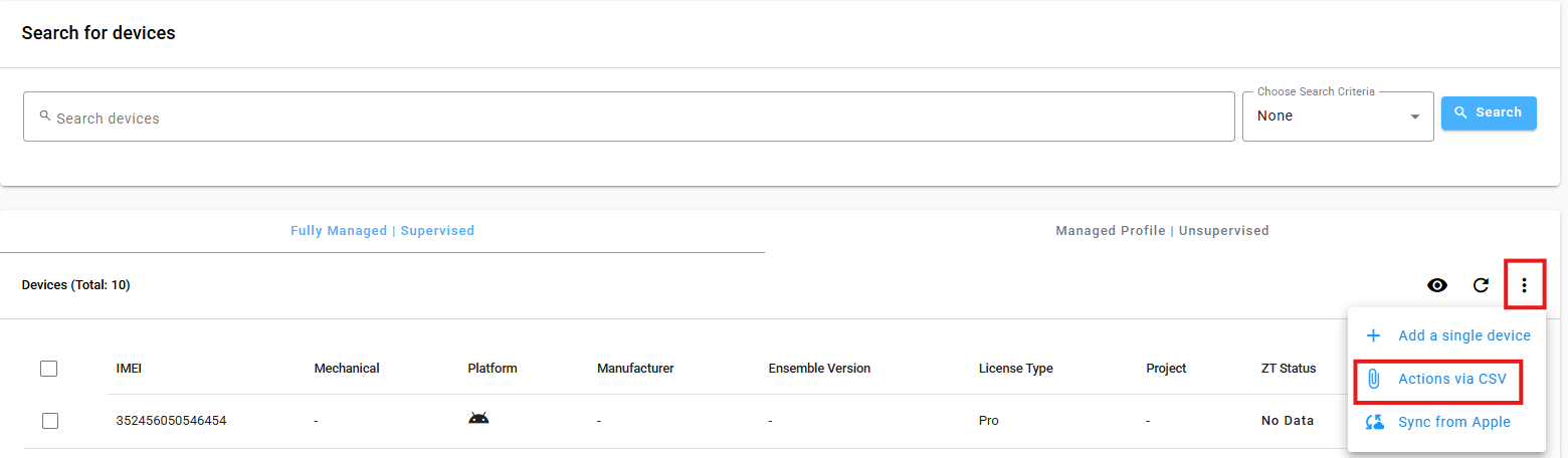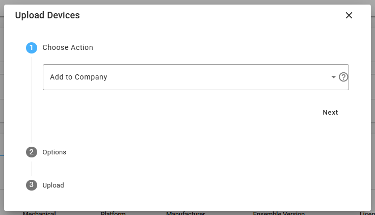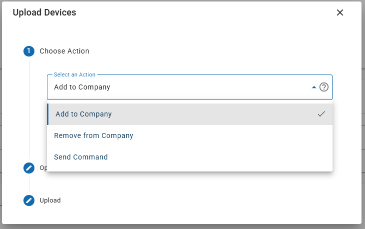 From the Company Devices table, choose Actions via CSV. (As shown in the image below) to open the Upload Devices dialog.