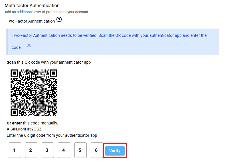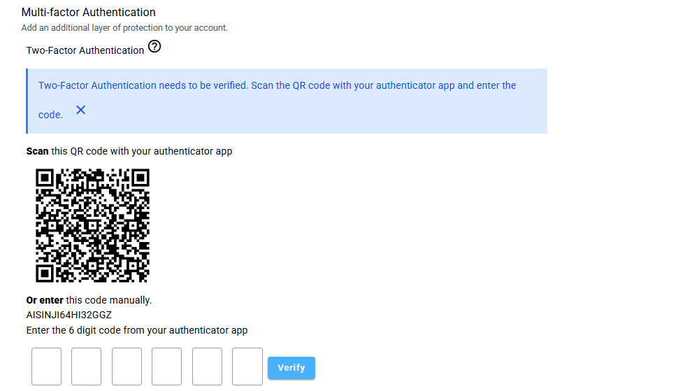 - Open a third-party authentication application of your choice on a mobile device to scan the QR Code that appears or to manually enter the provided code.