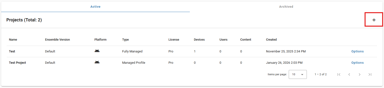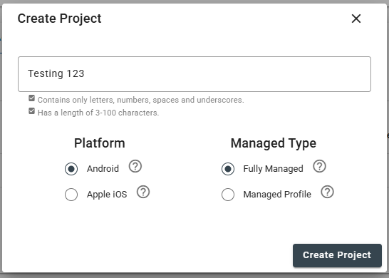 Ensemble projects are used to associate policies and content with devices. Projects can be created with one of two management types: Fully Managed or Managed Profile. This guide will serve as a walkthrough for the Fully Managed project type.