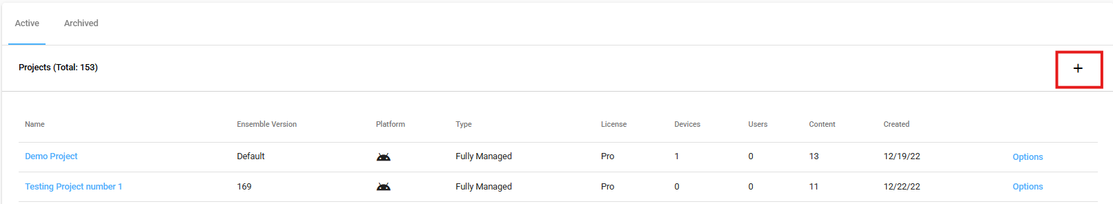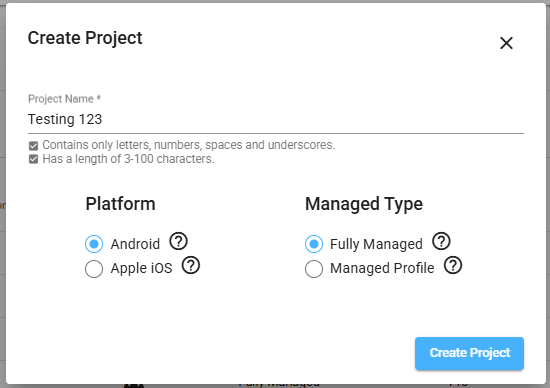 Ensemble projects are used to associate policies and content with devices. Projects can be created with one of two management types: Fully Managed or Managed Profile. This guide will serve as a walkthrough for the Fully Managed project type.