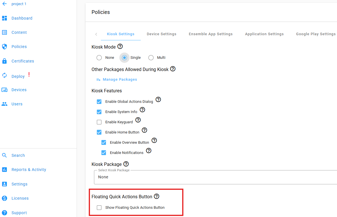 When you are in Single Kiosk Mode, there is no visible action bar while the kiosked application is open. To provide access to the Quick Actions, enable Show Floating Quick Actions Button, which is found in the Project | Policies | Kiosk Settings:
