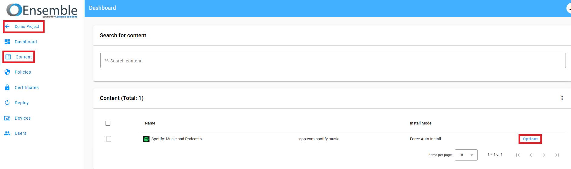 What if you want applications to appear in the restricted Play store, but don't want them installed automatically? Set Project | Content | Options | Auto-Install Mode to Do Not Auto Install. The application will appear in the restricted Play store, but will not install until the user chooses to install it. See the below picture for an example of this, with Spotify being set to Do Not Auto Install.